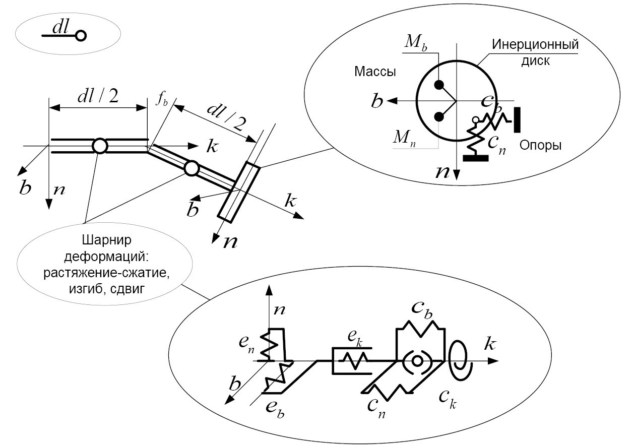 Устройство базового элемента представлено на рис. 1. Здесь изображены четыре безинерционных стержня; пары крайних соединены двумя обобщенными шарнирами деформаций, позволяющим смещения и повороты относительно трех ортогональных осей, а между средними возможны три последовательных поворота осей местной системы координат элемента; заканчивается базовый элемент инерционным диском, обладающим тензором инерции (при этом, к диску в заданных точках могут быть дополнительно прикреплены точечные массы жестко или на упругих связях, допускающих движение только вдоль одной из координатных осей). В случае наличия у элемента опоры, обладающей заданными жесткостями в определенных направлениях, действие ее реакций также приводится к соответствующей точке инерционного диска (см. рис. 1). Выбранная геометрия обусловлена тем, что криволинейные участки заменяются описывающей ломаной, к которой инерционные диски ортогональны.