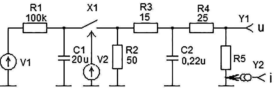 Генератор микросекундных импульсных помех длительностью 50 мкс по ГОСТ IEC 61000-4-5-2017 моделируется схемой, представленной на рис. 3.
