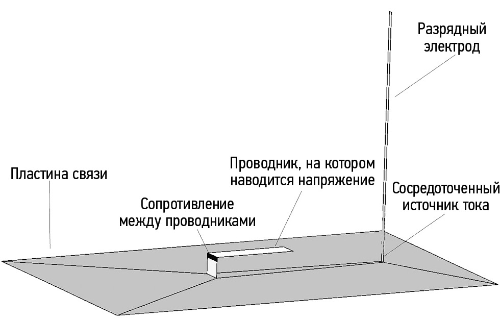 Ток ЭСР задается между проводящей горизонтальной пластиной связи размером 100 × 60 мм и перпендикулярной ей металлической полоской размером 60×1 мм, моделирующей разрядный электрод испытательного генератора или металлический предмет в руке человека (рис. 1). Точка соприкосновения разрядного электрода и пластины связи находится на расстоянии 15 мм от короткой стороны пластины и на равном расстоянии от двух длинных ее сторон. В центре пластины на расстоянии 5 мм от нее расположен проводник размером 20×5 мм. Проводник и пластина соединены вертикальным проводником. Между вертикальным и горизонтальным проводниками задано сопротивление 50 Ом. В качестве величины помехи рассматривается напряжение на этом сопротивлении (которое соответствует потенциалу, наведенному на горизонтальном проводнике относительно пластины связи). Все проводники предполагаются идеально проводящими.