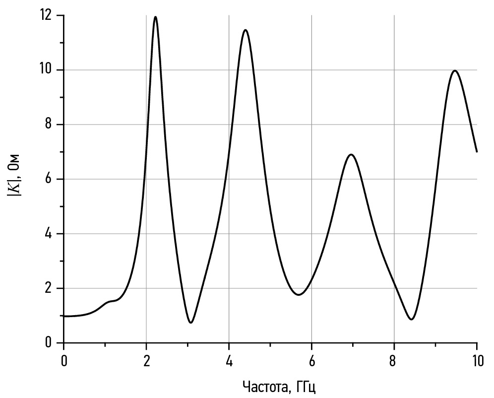 где t — время, выраженное в наносекундах. На рис. 2 показана спектральная плотность тока (5), полученная с помощью быстрого преобразования Фурье с шагом по времени τ = 0,05 нс и числом отсчетов N = 4096.