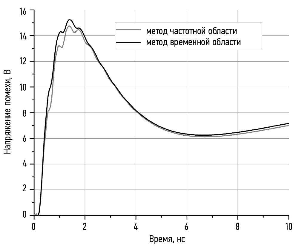 В работе показана принципиальная возможность использования методов частотной области для моделирования импульсных электромагнитных воздействий, таких как воздействие ЭСР. При этом воздействие каждой частотной составляющей анализируется независимо, что допускает высокую степень параллелизации вычислений, в то время как расчет методами временной области требует завершения расчетов для предшествующих моментов времени. Требования к размеру элементов расчетной сетки определяются длиной волны на максимальной учитываемой частоте. Результаты, полученные с помощью методов частотной области и методов временной области, совпадают с достаточной для практических расчетов точностью.