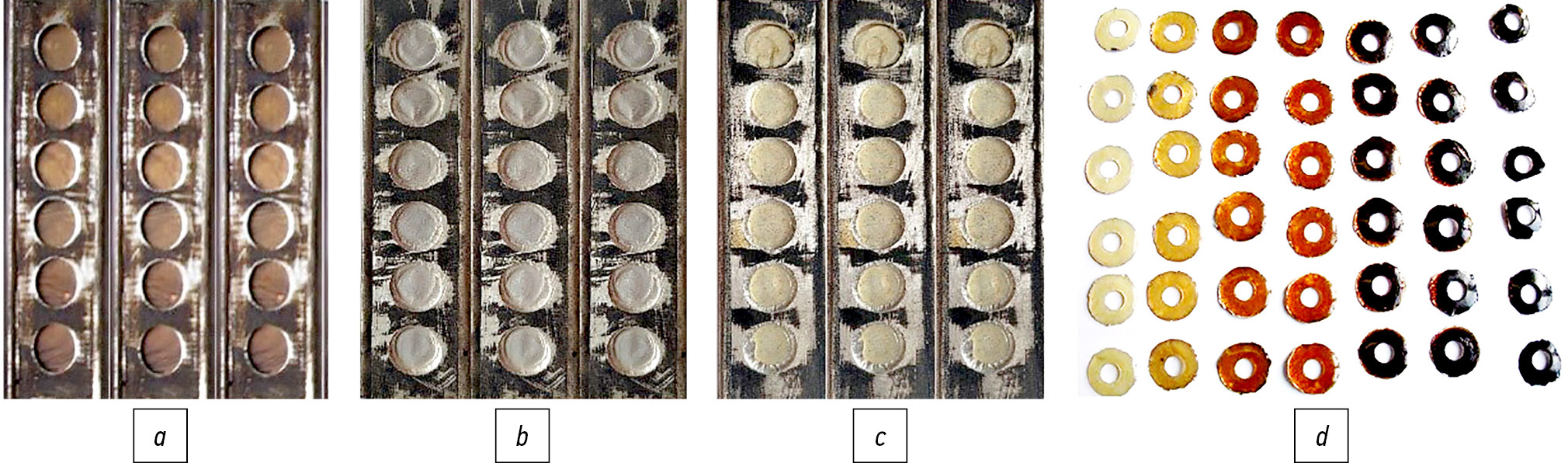 Fig. 1. Base unit (device used to combine samples): a, device with a copper plate; b, device with a copper plate and aluminum foil; c, device with molten polymer; d, samples after testing.