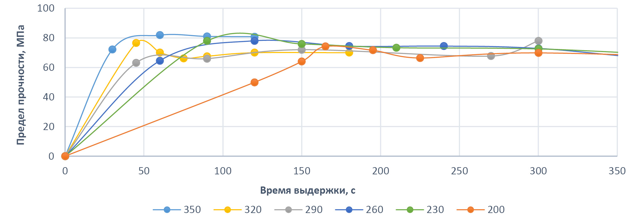 Рис. 3. Изменение прочности полимерного материала в диапазоне времени от 0 до 350 с.