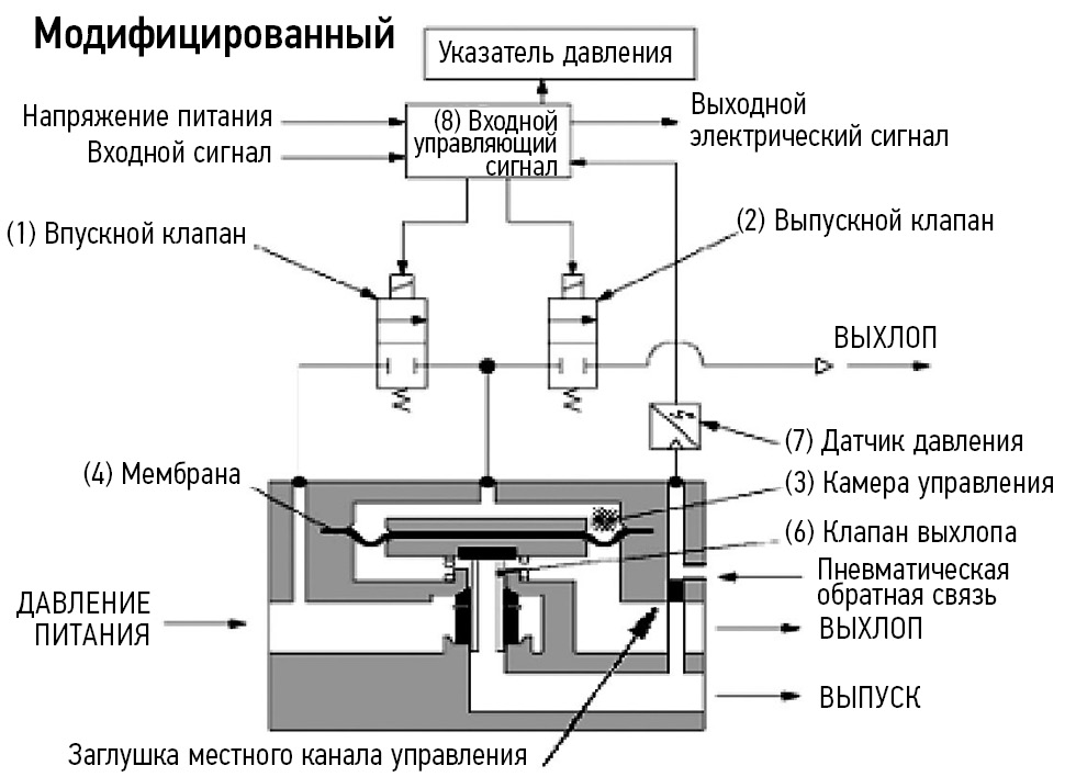 Возрастающее давление управления сверху на мембрану 4 через шток открывает клапан подачи давления 5, что приводит к пропорциональному увеличению давления на выходе электропневматического регулятора. По каналу обратной связи выходное давление поступает в камеру под мембрану 4 и на датчик давления 7. В результате преобразования на датчике 7 сигнал поступает в блок управления 8, в котором происходит сравнение полученного сигнала со входным.