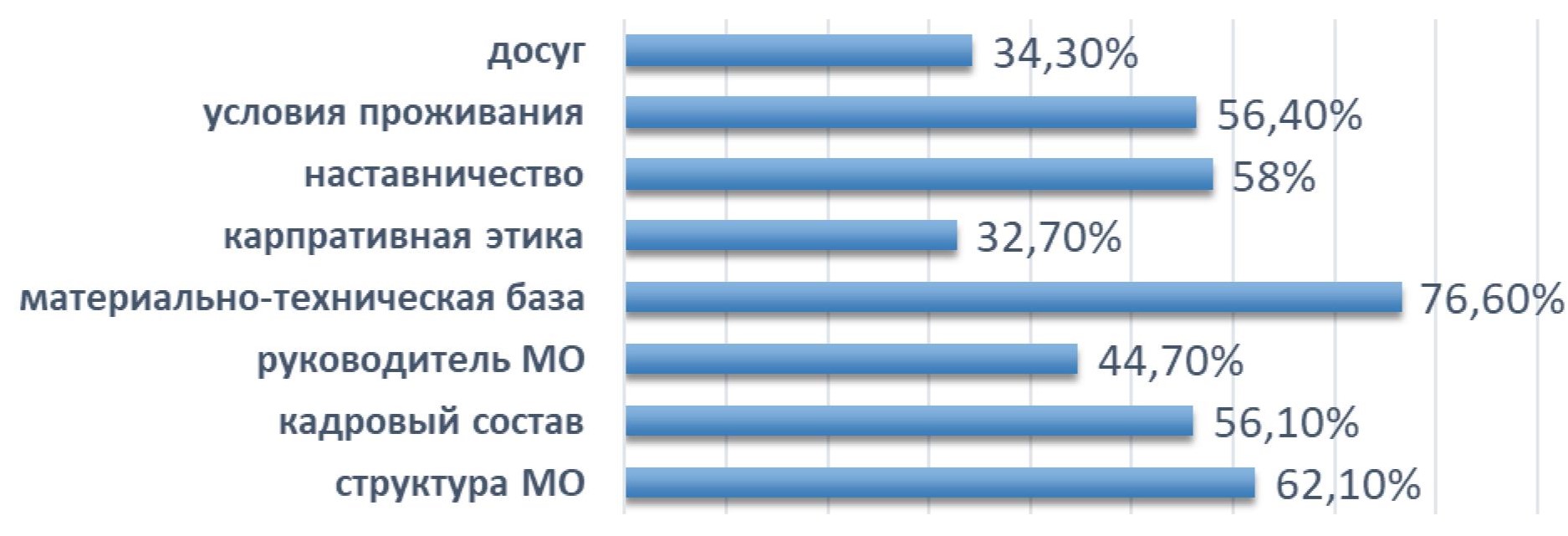 Из конкретных информационных разделов студентов больше всего интересует материально-техническое обеспечение районных медицинских организаций (76 % опрошенных). Далее в порядке убывания рейтинга следуют: структура медицинских организаций, наличие системы наставничества, условия проживания, кадровый состав и др. (рис. 4). Следует отметить, что в данном исследовании опрошенных выпускников практически не интересовал уровень заработной платы, этот раздел выбрали только 0,5 % респондентов.