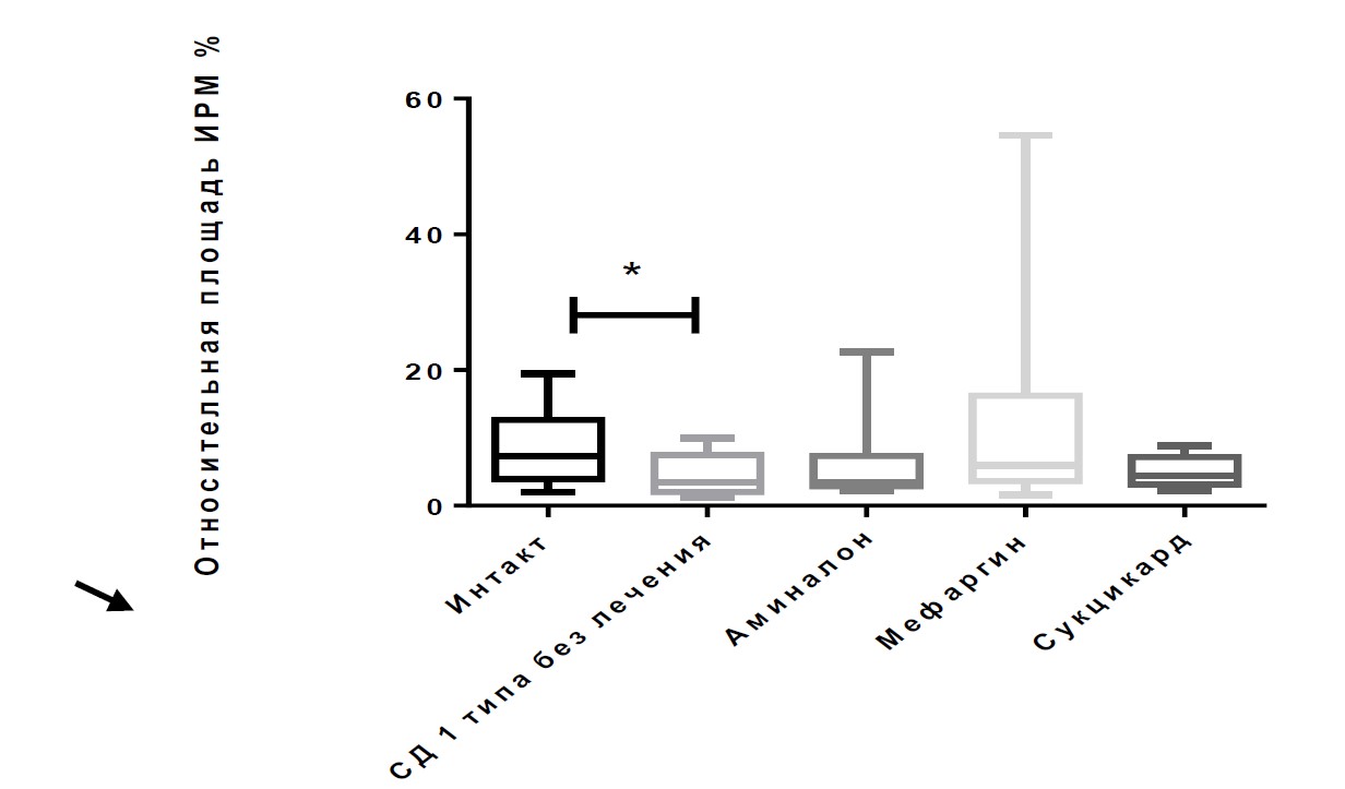 Рис. 1. Динамика изменения относительной площади Iba-1 – иммунореактивного материала в первичной соматосенсорной коре головного мозга. * – различия между группами СД 1-го типа и интакта статистически значимы (Anova-Тест), p < 0,05