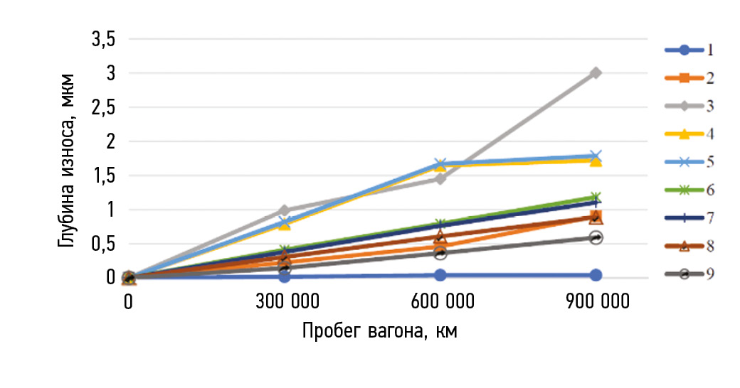 Результаты расчета с периодом 150 000 км показывают устойчивое изменение скорости износа как для ролика (рис. 3), так и для дорожки качения внутреннего кольца. Дальнейшее уменьшение периода пересчета условий взаимодействия роликов и колец не приводит к сколько-нибудь заметному уточнению накопленной величины износа. Из полученных результатов также следует, что износ дорожки качения внутреннего кольца происходит примерно в 1,5 раза быстрее, чем износ роликов.
