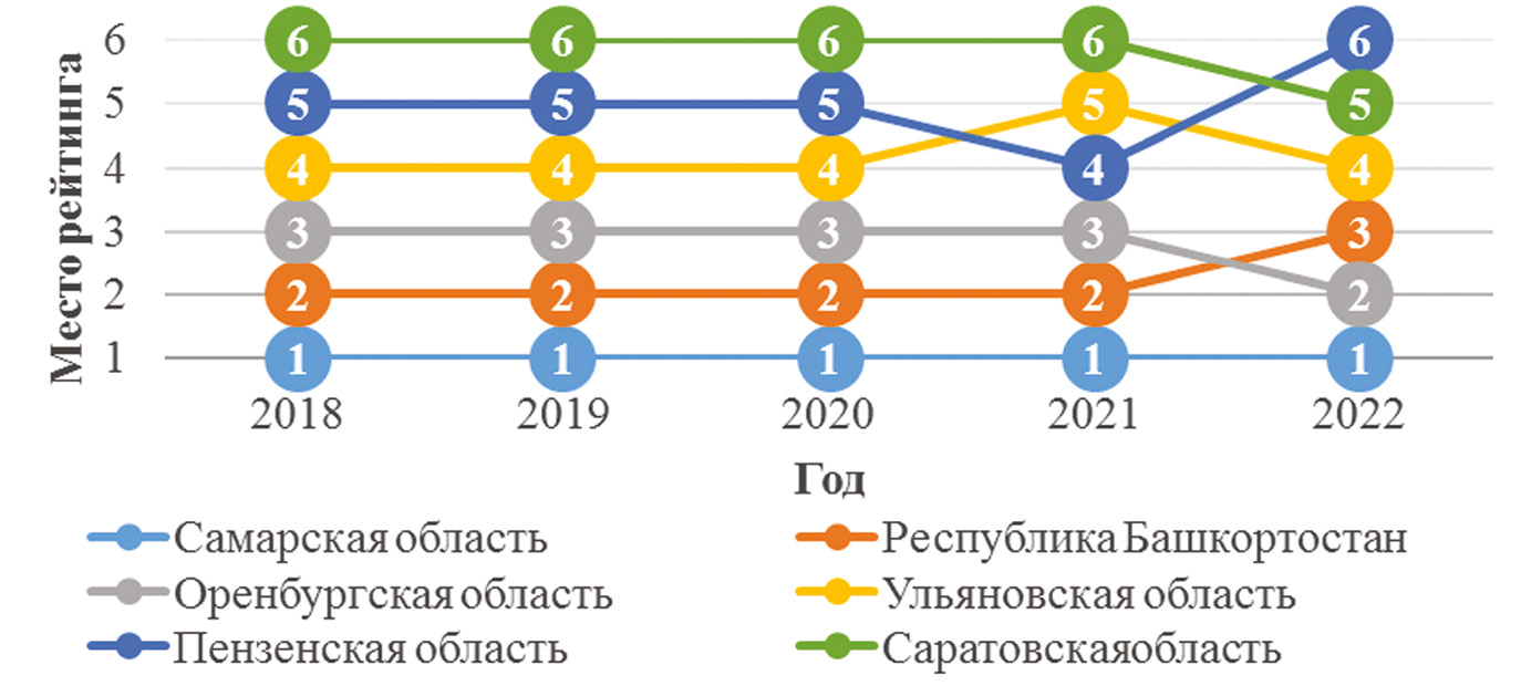 Рис. 1. Рейтинг субъектов РФ, входящих в состав Волго-Уральского макрорегиона, по значению интегрального показателя социально-экономического развития в 2018–2022 гг. [2]
