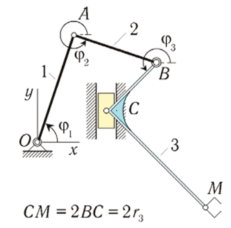 Дано: OA = r1 = 0,442 м; AB = r2 = 0,846 м; BC = r3 = 0,620 м; CM = 2r3 ; φ1(0) = 1,550 рад; φ2(0) = 5,758 рад; φ3(0) = 0,308 рад; xD(0) = 2,940 м; yD(0) = –1,360 м; xD(τ) = 1,640 м; yD(τ) = 1,560 м; βx(0) = 12,36; βy(0) = 2,24; δ = 0,022; τ = 1,20 c.