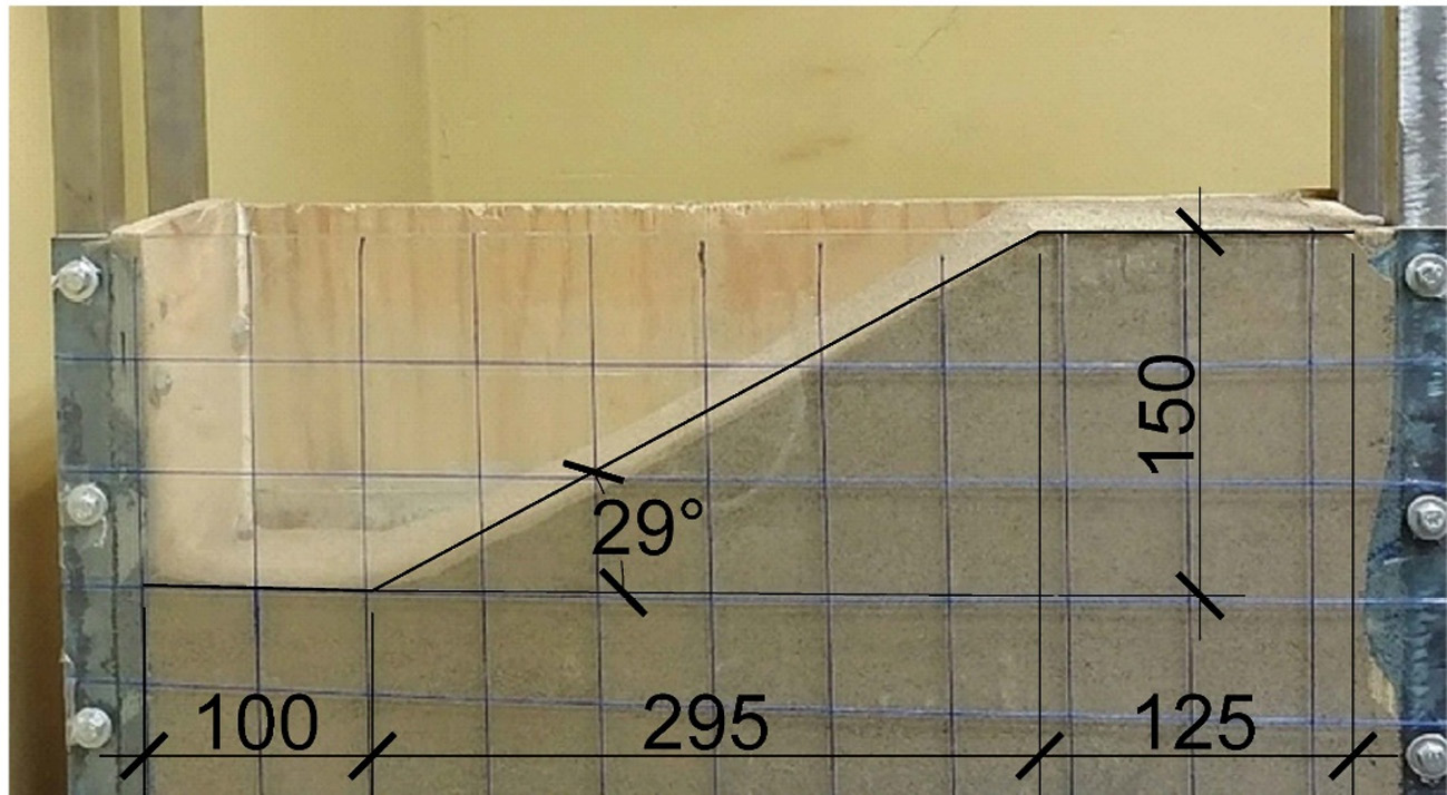 Методы. В ходе работы был проведен постановочный эксперимент в лабораторном лотке. Непосредственно перед началом исследования лабораторным путем в соответствии со стандартными методиками [1–4] были определены физико-механические характеристики песка, использующегося в качестве модели откоса: плотность (ρ = 1,6 г/см3), гранулометрический состав (песок средней крупности), угол естественного откоса (φ = 32°) и сила удельного сцепления (с = 0,8 кПа).