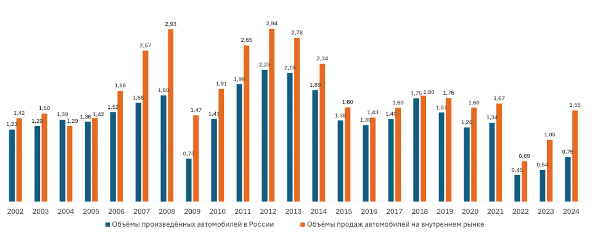 Рис. 1. Объемы продаж и производства автомобилей в России за период 2002–2024 гг., млн шт.