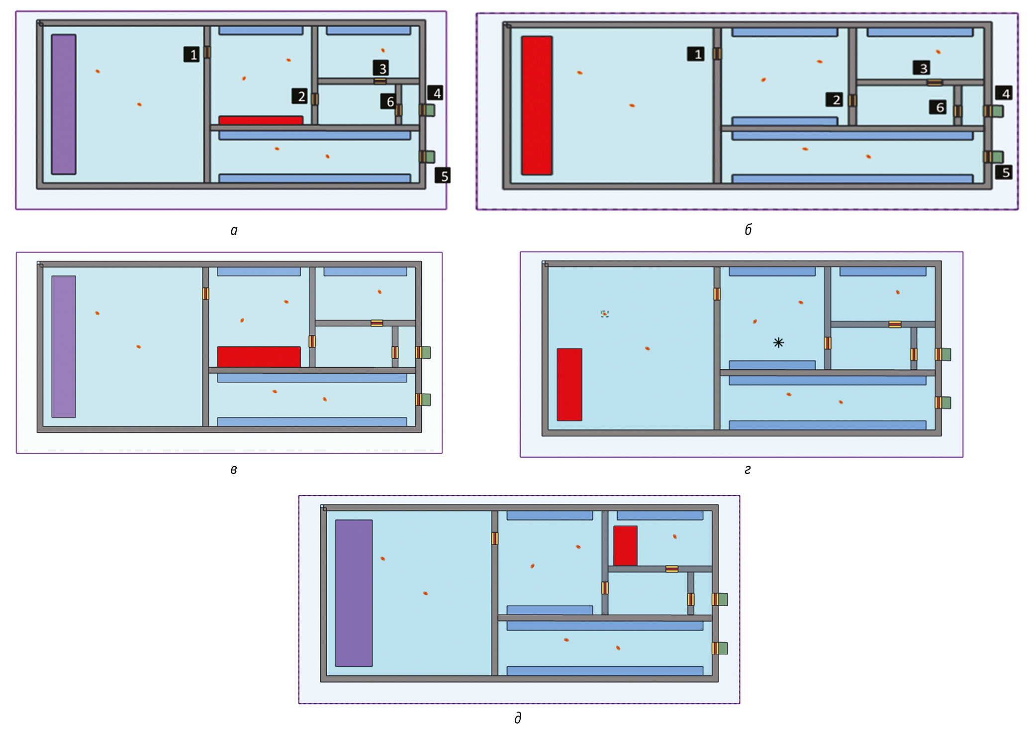 2. Рис. 1. Схема производственного объекта и сценарии пожара: а — сценарий 1; б — сценарий 2; в — сценарий 3; г — сценарий 4; д — сценарий 5; 1–6 — нумерация дверей помещений