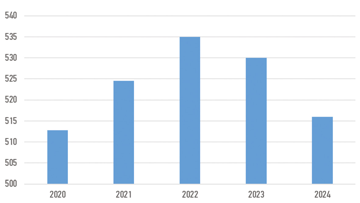 Рис. 1. Уровень добычи нефти в РФ млн тонн/год