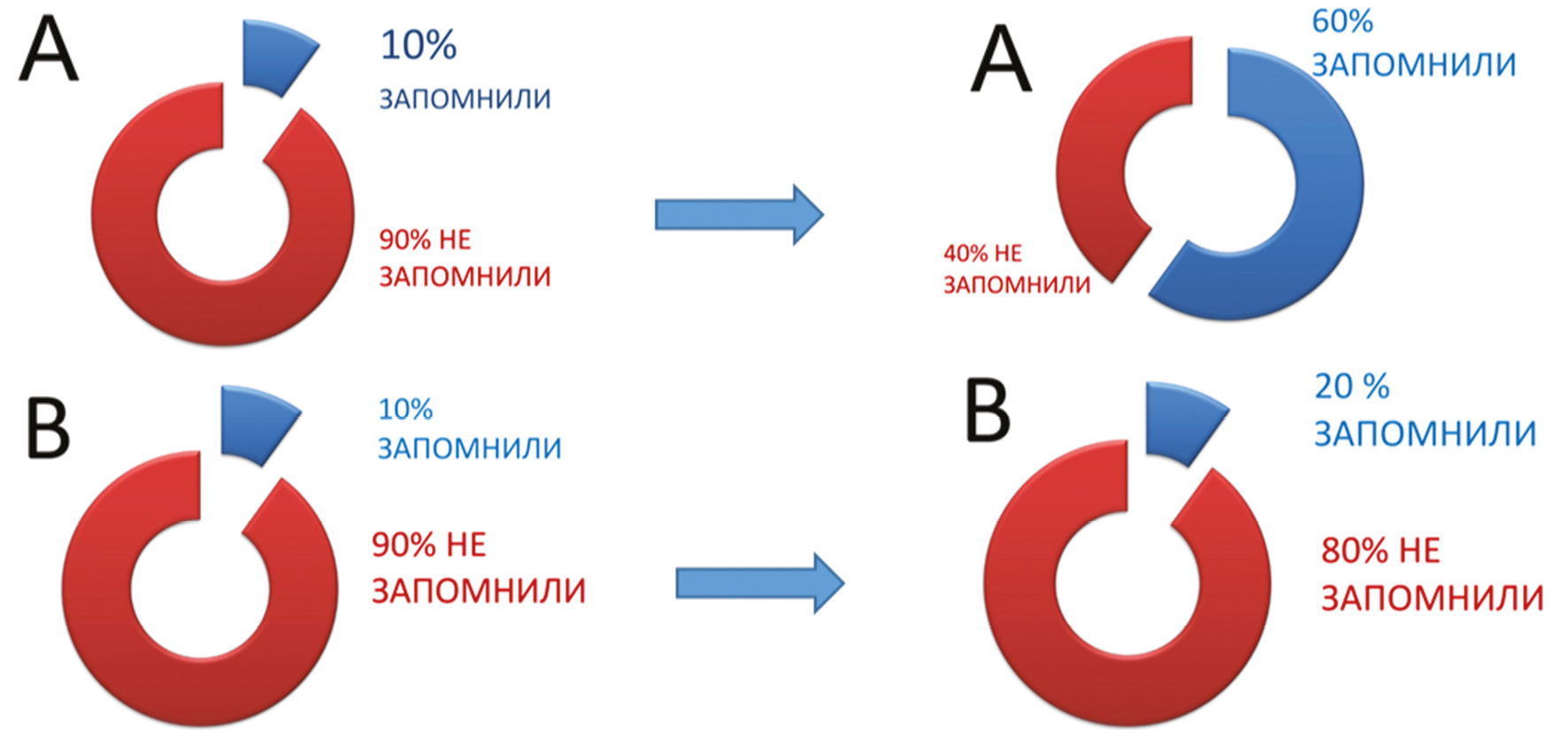 - улучшение усвоения материала: в контрольной группе, использующей арт-технологии, процент запоминания иероглифов увеличился с 10 до 60 %, в то время как в контрольной группе без арт-технологий этот показатель увеличился только на 10 % (см. рис. 1).