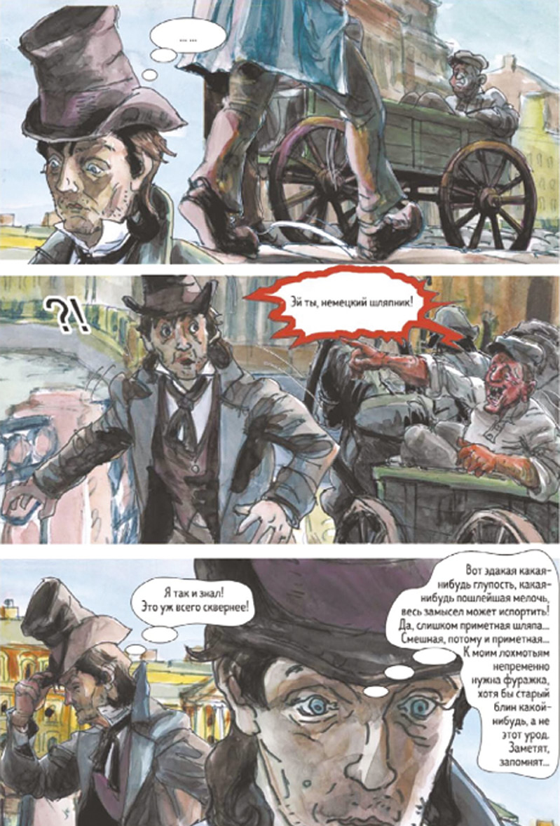 В комиксе «Преступление и наказание» (рис. 3) оскорбление в адрес Раскольникова, подчеркнутое красным филактером, акцентирует его бедность и социальное неравенство.